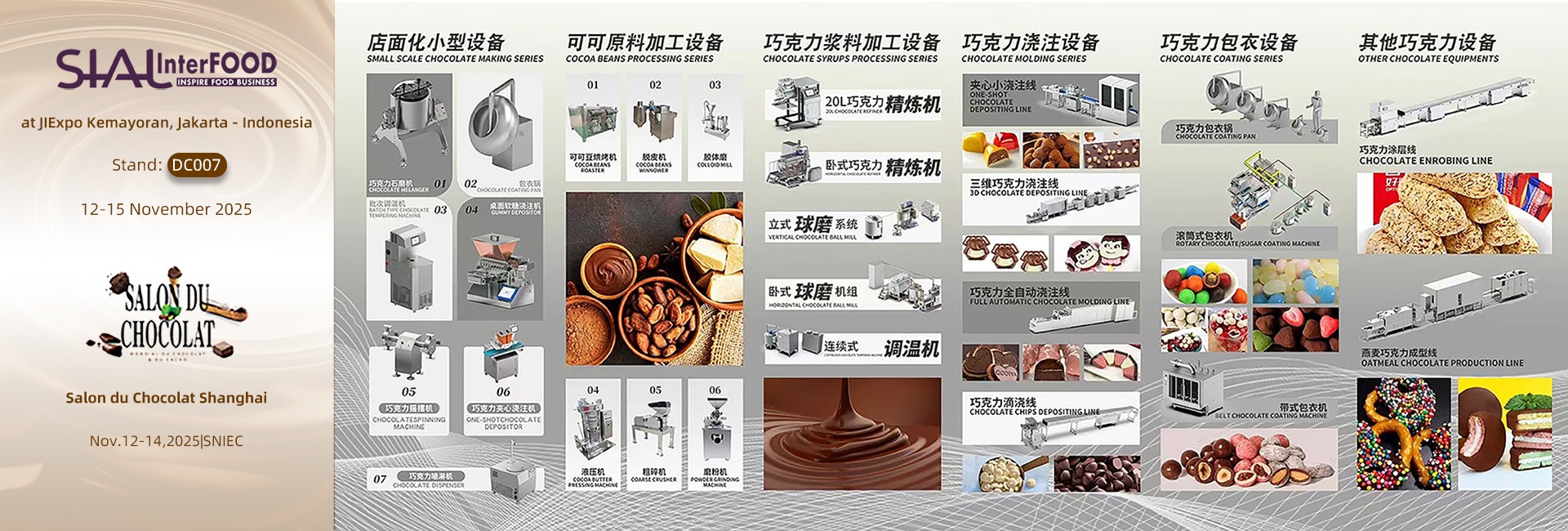 Productos principales:Molino de bolas de chocolate, máquina de templado de chocolate, máquina de depósito de chocolate, máquina de recubrimiento de chocolate, tanque de retención de chocolate